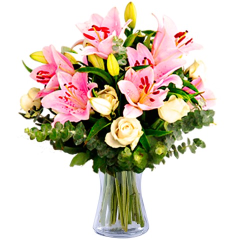 Pembe Lilyumlar beyaz güller ve dekoratif yapraklardan oluşmaktadır.