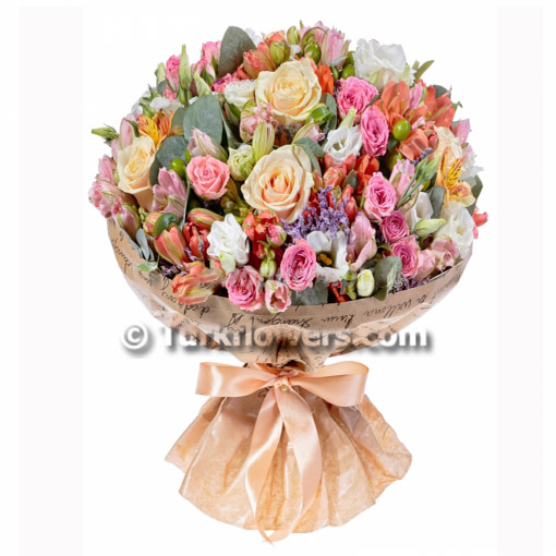 7 Adet Krem Gül , Turuncu pembe astromerya beyaz lisiantus yeşil hiperikum ve 3 adet çardak pembe gülden oluşmaktadır
