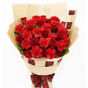 12 adet kırmızı gül ve 16 adet kırmızı karanfil den oluşan buket