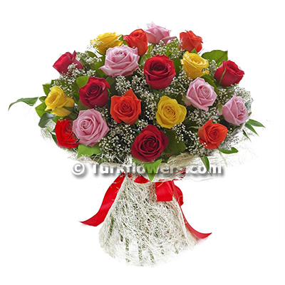 21 adet Renkli  gül  ve taze yeşilliklerle hazırlanmıştır .. Ürün tasarımı yerel çiçekçilere göre değişebilmektedir
