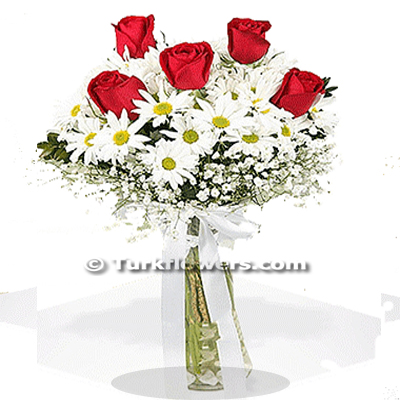 Cam vazo içerisinde 5 Kırmızı Gül ve 2 Demet papatya