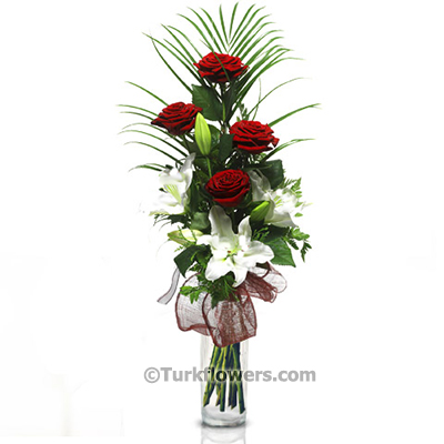 Sevgililer Günü Çiçeği 4 Adet Kırmızı gül 1 dal Lilyum dan oluşan aranjman Add to cart and continue to send our flower to KostaRika  Hako region.