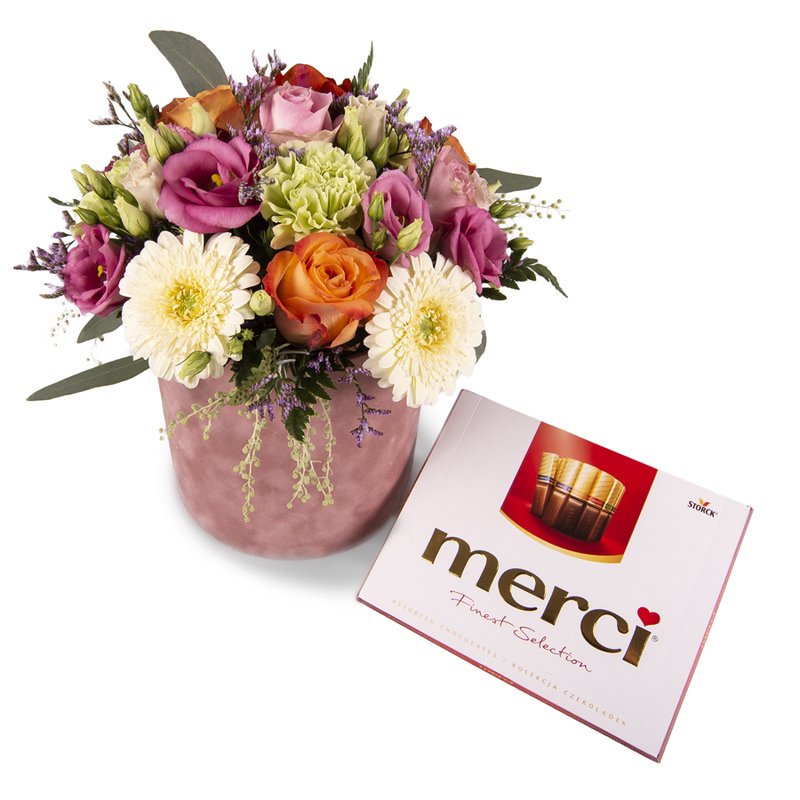 MERCI çikolata ile bir sette bulunan güzel Çiçek Kutumuz. Çiçek Kutusu renkli çiçeklerden oluşur: gerber, güller, karanfil ve özel ürünler yerel çiçekçi tarafından düzenlenecek ve teslim edilecektir. Çiçeklere ücretsiz bir tebrik kartı ekleyebilirsiniz.