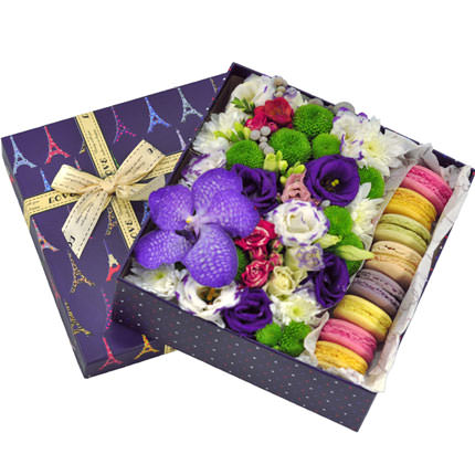 Bileşimi: 8 çıtır Macaron kurabiye , orkide ç , 2 dal pembe sprey gül , 2 adet yeşil kasımpatı Santini , 2 şadetbeyaz papatya kasımpatı , Astromerya, dekoratif hediye kutusu