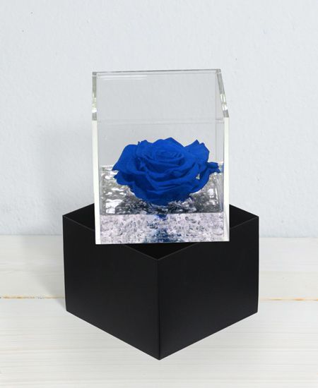 4 Yıl solmayan canlı Mavi Gül, açık bir kapakla (10x10cm ölçülerinde) kristalleşmiş bir jel tabanı üzerinde bir pleksiglas küpünün içinde hala kokulu bir şekilde teslim edilecektir. Teslimat, İtalya firmamız  tarafından kullanılan kurye ile teslim edilecektir.