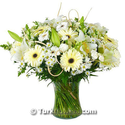 C Serbia beyaz Beyaz lilyum ve beyaz çiçeklerden oluşan buket . Cam vazo hediyeli