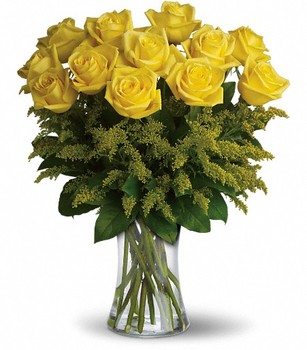 Cam vazo içerisinde 12 sarı gül ve soliler , Ürün tasarımı yerel çiçekçilere göre değişebilmektedir..