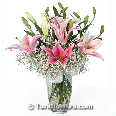 Ürün cam vazo içerisinde beyaz çakıl taşları , 2 dal pembe renkli lilyum ve 1 demet cipsofilya dan oluşmaktadır.