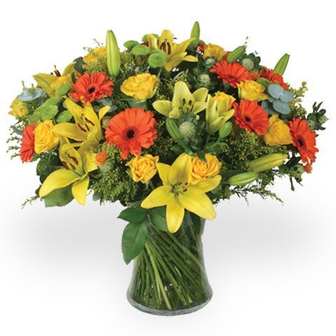 Ürün vazo içerisinde 3 adet sarı   (asya ) lilyum 6 adet sarı gül ve turuncu renkli gerberalardan oluşmaktadır ..