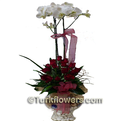 Ürün çift dallı beyaz orkide , 15 adet kırmızı gül den cam vazo içerisin de düzenlenmiştir . Ortalama ürün boyutları yükseklik 65 cm genişlik 50 cm dir