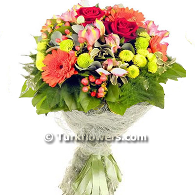 2 Adet kırmızı gül ve Renkli Mevsim çiçeklerinden oluşan Buket