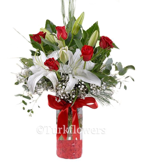 Ürün 5 adet kırmızı gül , 1 Dal kokulu beyaz Lilyum yeşillik ve cipsofilyadan oluşmaktadır. Fiyata vazo dahildir...