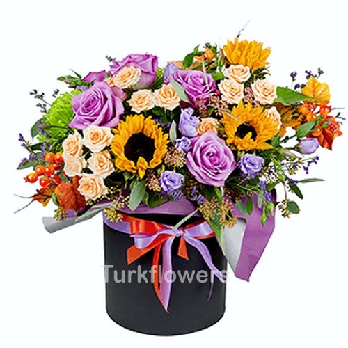 Kutu içerisinde ayçiçeği ve renkli çiçekler
