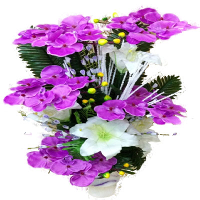 Lila ve beyaz çiçeklerden oluşan yapay çiçek modeli , ortalama Ürün boyutları yükseklik 65 cm genişlik 50 cm  ürün renkleri aynı kalmak şartı ile tasarımlarda farklıklıklar olabilir ..