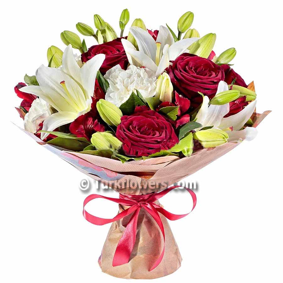 Ürün içeriği: 2 dal lilyum, 5 Kırmızı Gül, 3 Beyaz Kranfil  1 demet astromerya