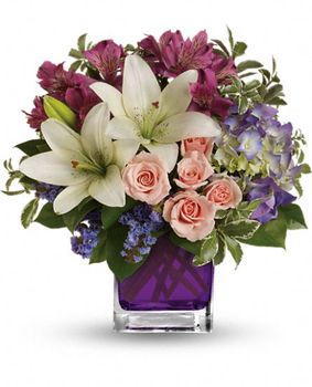 Ürün Mor ortanca, açık pembe sprey gül ve beyaz asia lilyumu iel Mor vam vazo içerisinde düzenlenmiştir..