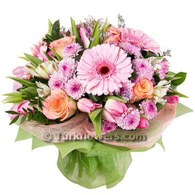 Ürün 5 adet pembe gül, 1 demet pembe papatya, 5 lale ve 1 Demet Astromerya dan oluşmaktadır..