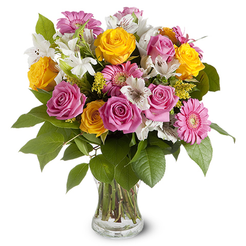 Ürün pembe Güller,  sarı güllerle , gerberalar ve astromeryalar ile düzenlenmiştir