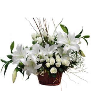 sepet içerisinde Beyaz lilyum ve beyaz güller aranjman