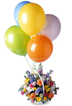Sepet içerisinde renkli balonlar ve renkli çiçeklerden oluşan aranjman