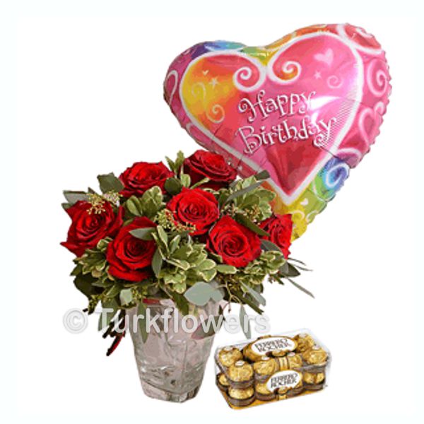 Vazoda 7 kırmızı gül folyo doğum günü balonu ve 16 lı ferrorocher çikolatadan oluşan doğum günü kompozisyonu