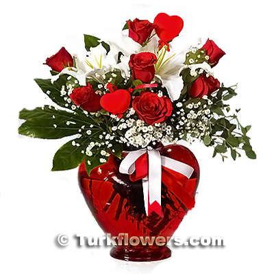 Ürün  Kalp vazo içerisinde 1 dal lilyum ve 7 adet kırmızı gülden oluşmaktadır