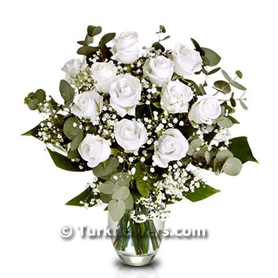 Ürün cam vazo içerisinde taze yeşillikler ve 12 adet beyaz güllerden oluşmaktadır .. Saf ve temiz duygunun ifadesi bu beyaz gülleri Türkiye de her noktaya gönderebilirsiniz .