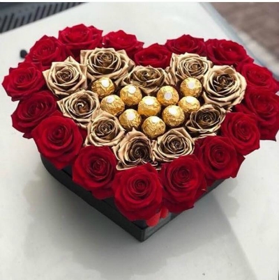 Altın rengi gül çikolata ve kırmızı güller Kalp şeklinde kutudan oluşmaktadır. Bu kompozisyon için özel bir tercihiniz var ise sipariş formund abize bildirebilirsiniz