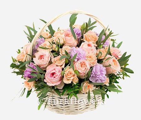 İçerik: 4 krem ​​sprey gül, 7 mor karanfil, 8 şakayık gül ve okaliptüs bir sepet içinde