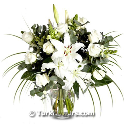 Ürün 11 adet beyaz gül 2 Dal beyaz kokulu lilyum ve otaze yapraklarla cam vazo içerisinde düzenlenmiştir .