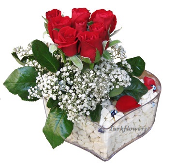 Ürün plastik kalp şeklinde vazo içerisinde beyaz çakıltaşları ve 5 adet krımızı gülden oluşmaktadır , ürünün ortalama boyutları yükselik 17 cm genişlik 13 cm dir .. Küçük illerde ve beldelerde tasarmda değişiklik olabilrir..