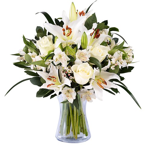 Oryantal lilyum, gül ve Alstromerya ile beyaz çiçeklerden oluşmaktadır