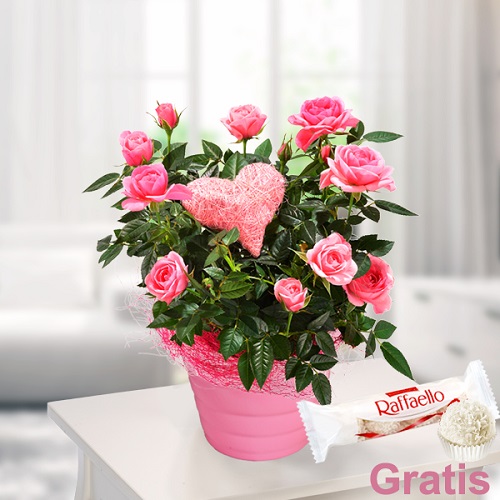 Vivid rose plant in a beautiful ceramic flowerpot with beautiful blooms arranged with a Pink decorative Heart. Height is about 40cm.