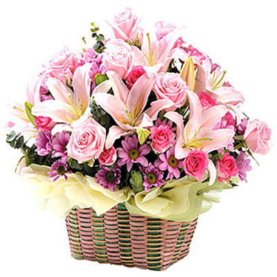 Sepet içerisinde pembe renkli lilyum ve güllerden oluşan