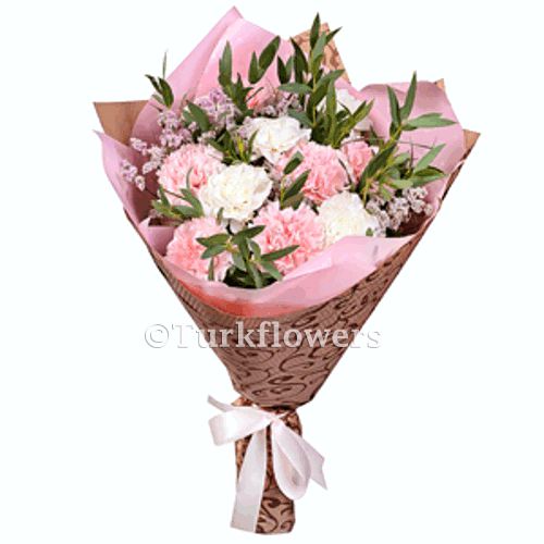 11 pembe beyaz karanfil buketi