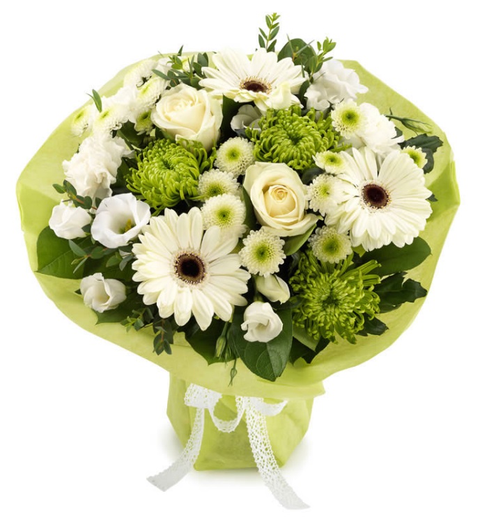 Gerbera gül ve krizantemden oluşan beyaz ve yeşil tonlarında yumuşak bir buket
