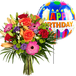 Uzun saplı gerberalardan, güllerden ve lilyumlardan birçok renkte buket, diğer küçük mevsimlik çiçekler ve çeşitli yeşilliklerle zenginleştirilmiş. Doğum günü Balonu İle bİrlikte