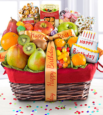 1 Braeburn apple, 1 Crimson Red Pear, 1 D'Anjou Green Pear, 2 Kiwis, 1 navel orange, 1 Granny Smith apple, 3 Tangerines: 1 Mango, bagel, in a beautiful natural dark wood woven basket with a bright red cloth lining. Peanut Brittle, Petite Fruit Mix, a Happy Birthday Cake, .Birthday Caramel Popcorn. This gourmet fruit basket is a great way to send warm wishes to friends and family near and far.