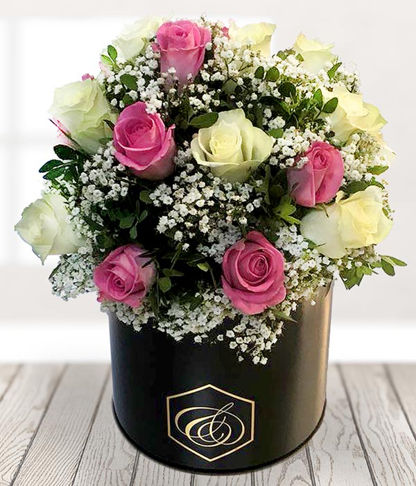 Silindir Şapka kutusunda Pembe Beyaz güller