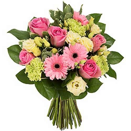 Yeşilliklerle birlikte açık pembe ve beyaz tonlarda yuvarlak gerbera, gül ve diğer mevsimlik çiçeklerden oluşan buket.