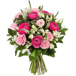 Pembe fuşya tonlarında (çiçekçideki mevcudiyetine göre) birkaç çiçek türünden oluşan çiçek buketi, soluk pembe ve farklı yeşillikli krem Çiçekler