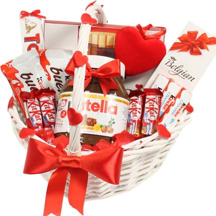 Kompozisyon : bir kutu çikolata "Merci" 250g ., Nutella 360g bar "Kinder Bueno", 3 küçük bar "Kinder Maxi", bar "Kit-Kat", çikolata "Roshen", sepet, çiçek malzemesi. (Stoktaki bu modelin yokluğunda sepet aynı tipte değiştirilebilir. Sepetler şeffaf selefon ambalajında ​​teslim edilir.)