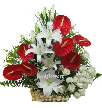 Ürün 7 adet kırmızı antorium , 2 dal beyaz lilyum ve 15 adet beyaz güllerden oluşmaktadır , ortalama ürün boyutları yükseklik 65 cm genişlik 55 cm dir , ürün büyükşehirler dışında farklılık gösterebilir , sipariş vermeden önce bilgi almanızı rica ederiz ...