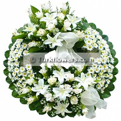 Beyaz lilyum gül ve Krizantemlerden oluşan cenaze taziye çiçeği