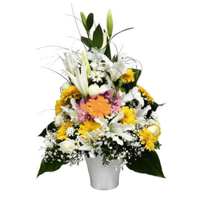 Boylu beyaz ve sarı renkli çiçeklerden oluşan aranjman .