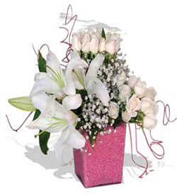 Cam vazoda beyaz güller ve lilyumdan oluşan aranjman Add to cart and continue to send our flower to Azerbaijan  cam region.