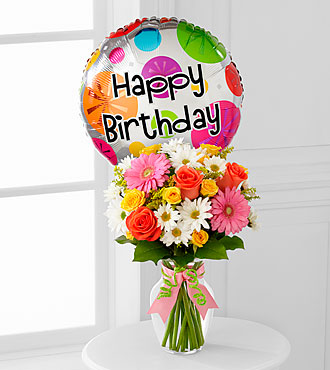 Mercan güller, sarı sprey güller, pembe gerbera, beyaz geleneksel papatyalar, solidago ve gür yeşillik mükemmel pembe saten ve yeşil şönil şeritler ile bağlı klasik bir açık cam vazo içinde düzenlenmiştir. Hppy Birthday yazan folyo balonla gelmektedir.  Bu Buket onların doğum günü şenliklerine Mutluluk katıcak