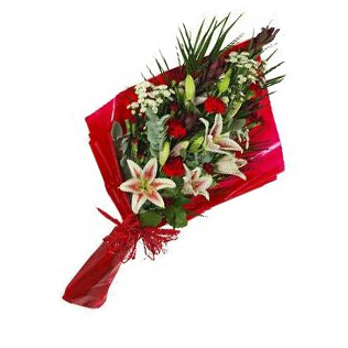 8 Adet kırmızı gül ve lilyumdan oluşan buket