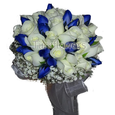 Ürün 20 adet beyaz gül ve 15 adet mavi gülden oluşmaktadır , Ürünün ortalama boyutları Genişilk 25 cm Çiçek tutma boyutu 25 cm dir , ürünü sipariş vermeden önce bilgi almanızı rica ederiz