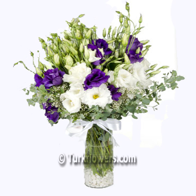 Vazo içerisinde 1 demet Mor Lusyentus ve 1 Demet Beyaz Lusyentus.